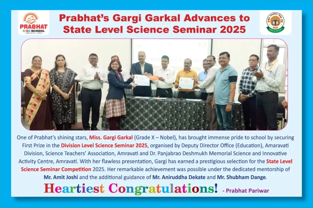 Prabhat’s shining star, Miss Gargi Garkal, has brought great pride to the school by securing First Place at the Divisional Level Science Seminar 2025, organized by the Deputy Director (Education) Office, the Science Teachers’ Association Amravati, and the Dr. Punjabrao Deshmukh Memorial Science and Innovative Activity Centre, Amravati.
