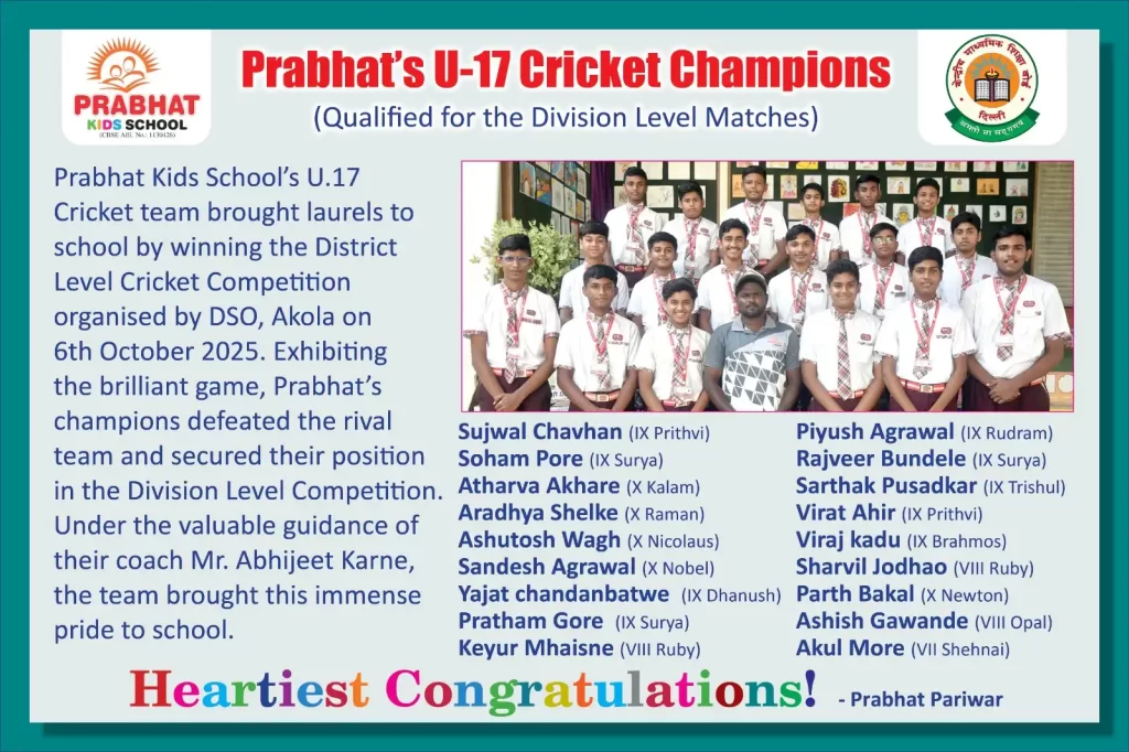 Prabhat Kids School’s Under-17 Cricket Team brought immense laurels to the school by winning the District Level Cricket Competition, organized by the DSO, Akola.